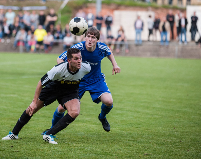Zweikampf zwischen dem Querischieder Manuel Allard (links, schwarz) und dem Schwemlinger Frederic Britten (rechts, blau).
