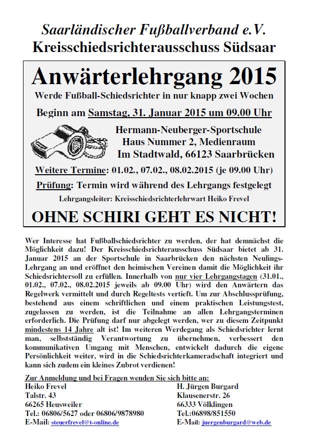 Zur Anmeldung kann man sich auch gerne an den Kreisschiedsrichterlehrwart Heiko Frevel, Talstr. 43, 66265 Heusweiler, Telefon: 06806/5627 bzw. 06806/9878980, steuerfrevel@t-online.de bzw. H. Jürgen Burgard, 06898/851550, juergenburgard@web.de wenden.