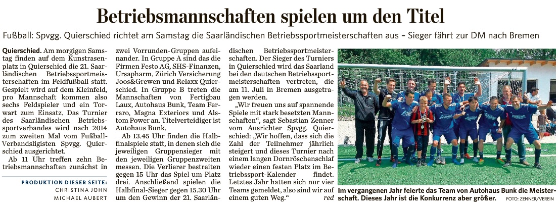 Am Samstag findet ab 11 Uhr die Saarländische Betriebssport-Meisterschaft (SBM) 2015 im Feldfußball (Kleinfeld) auf dem Quierschieder Kunstrasenplatz am Franzenhaus statt. Durch eine kurzfristige Absage wurde kurzfristig ein Startplatz frei, der allerdings dankenswerterweise von der Bezirksdirektion Joos&Grewen der Zürich Versicherung übernommen wurde.Die Veranstaltung des Saarländischen Betriebssportverbandes wird von der Spvgg. Quierschied ausgerichtet. Hauptsponsor ist die Firma Ha-Ra aus Fischbach-Camphausen.