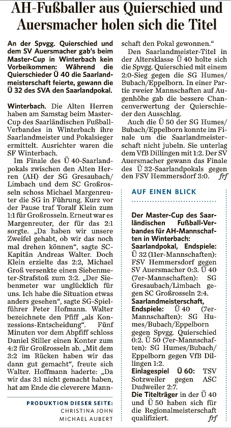 Der Fußball-Regional-Verband „Südwest“ ermittelt seine beiden Teilnehmer für die Endrunde um den Ü40-Cup des DFB. Qualifiziert für die Regionalmeisterschaft haben sich die jeweiligen Verbandsmeister SG Alsdorf/Kirchen (Rheinland), SG Hoppstädten-Weiersbach (Südwest) und SpVgg Quierschied (Saarland). Jede Mannschaft hat je ein Heim- und ein Auswärtsspiel; der Erste und der Zweite nehmen als Vertreter des FRV „Südwest“ an der Endrunde des DFB vom 18. – 20.09.2015 in Berlin teil.