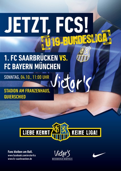Am kommenden Sonntag, den 04.10.2015 kommt es um 11:00 Uhr auf unserem Rasenplatz am Franzenhaus wieder zu einer sehr interessanten Partie in der U-19 Bundesliga Süd/Südwest. Die A-Jugend des 1. FC Saarbrücken empfängt den FC Bayern München. Im vergangenen Jahr lockte diese Partie 1200 Zuschauer nach Quierschied und auch in diesem Jahr erwartet unsere Spvgg als FCS-Partner und Organisator der Heimspiele wieder zahlreiche Zuschauer.