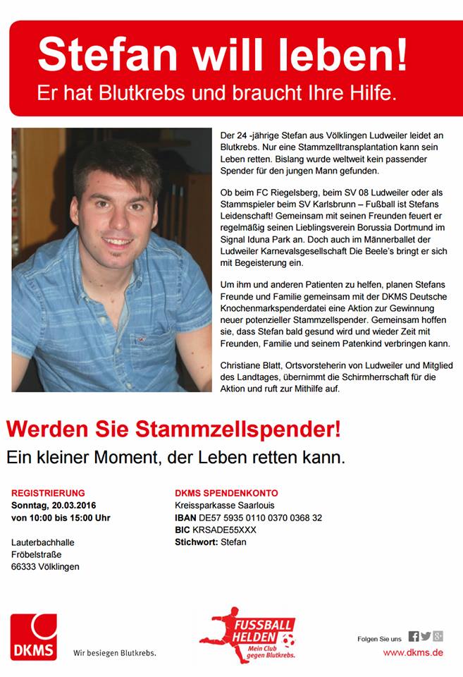 der im Hinspiel noch mit auf dem Platz stand, sucht dringend einen Stammzellenspender. Dafür findet am Sonntag, den 20.03.16 eine Registrierung potentieller Spender statt (siehe Bild). Wir nutzen gerne die Gelegenheit für unsere Freunde aus Karlsbrunn und vor allem für Stefan hier ebenfalls etwas Aufmerksamkeit zu erregen. Wir wünschen gute Besserung!