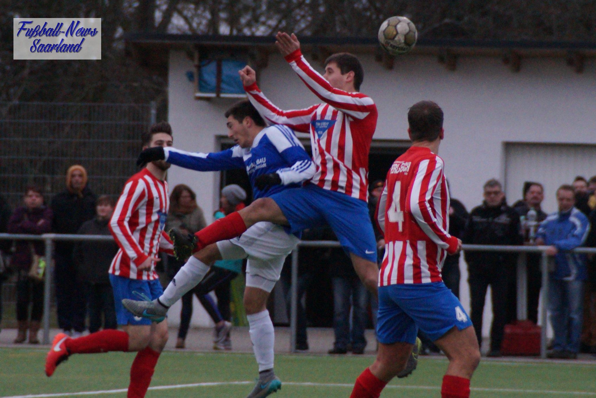 Nur knapp 100 Zuschauer wollten zur Anstoßzeit um 16:45 Uhr das Spiel gegen den Verein aus dem Dreiländereck sehen. Trainer Markus Woll veränderte die Mannschaft auf einigen Positionen, unter anderem musste er auf Nils Welter verzichten. Schon vor dem Spiel sprach sich die Brotdorfer Niederlage gegen Beaumarais auf dem Sportplatz rum, was wohlmöglich eine Zusatzmotivation für unsere Mannschaft hätte darstellen können. Doch unsere Spvgg bot vor allem im ersten Abschnitt eine durchwachsene Partie. Erstmals von Beginn war Winter-Neuzugang Lukas Mittermüller im Einsatz, der im Januar aus Hasborn kam. Er konnte aus dem Gewühl heraus das 1:0 nach 10. Minuten erzielen. Doch das Tor gab der Truppe von Coach Woll keinen großen Auftrieb, viele Unsicherheiten im Spielaufbau schlichen sich ein und ermöglichte den Gästen, die unter der Woche noch das Pokal-Viertelfinale bestritten, Chancen auf den Ausgleich. Nach einem unnötigen Ballverlust an der Eckfahne kamen die Perler zum 1:1 Ausgleich durch Pascal Hurth. Danach sahen die Zuschauer ein überschaubares Spiel, mit vielen kleinen Fouls und Nicklichkeiten. Nach 30. Minuten hatte Manuel Allard freistehend am zweiten Pfosten eine gute Einschusschance, doch sein Abschluss ging am Kasten vorbei. Kurz vor dem Pausentee bekamen die Wambe einen Handelfmeter zugesprochen. Die große Chance auf die Führung, doch Allard setzte den Ball am linken Pfosten vorbei. 1:1 hieß es zur Pause. Den zweiten Abschnitt eröffnete Perl mit einer Großchance durch Frederic Britten. Der Stürmer steuerte alleine auf das Tor zu, schoss allerdings links am Gehäuse vorbei. Da hatte Quierschied großes Glück. In der 55. Minute fiel dann aber die Führung für die Gäste, die ohne Spielmacher André Steger auskommen mussten. Erneut traf Hurth zum 2:1, alleine vor Torwart Kai Berrang. Aber die Spvgg fing sich und wusste nun, dass man die Big Points holen muss. Mexhid Kadrija traf nach 60 Minuten per Abstauber zum 2:2. Mit einem herrlichen Schuss traf Lukas Mittermüller in der 70. Minute zum 3:2. Er nahm den Ball mit der Brust an und hämmerte ihn ins rechte Eck. Ein wunderschönes Tor und eine Bestätigung seines Beginns in der Startelf.
