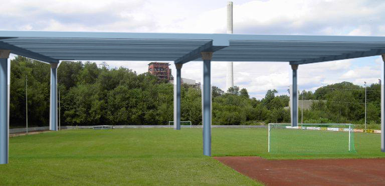 Unser Verein lebt von Visionen, Illusionen, neuen Ideen und Konzepten. Ende des vergangenen Jahres, als sich die Wetterlage zusehens verschlechterte, kam unserem zuständigen Fachmann für die Pflege unseres Naturrasenplatzes Bernie Maurer eine sensationelle Idee. Um den hervorragenden Rasenplatz dauerhaft in sehr gutem Zustand zu erhalten, könne sein enger Freund unser neuer Vorsitzender, Bauunternehmer Patric Schmidt, doch den Rasenplatz überdachen. Mit seiner nicht ganz ernstgemeinten Anmerkung trat Maurer eine Lawine los, die sich bishin zu konkreten Bauvorhaben entwickelte. Patric Schmidt zeigte sich von der Idee begeistert und ließ die Experten seiner Firma über mögliche Lösungen nachdenken. Das Ergebnis: eine erste Fotomontage:
