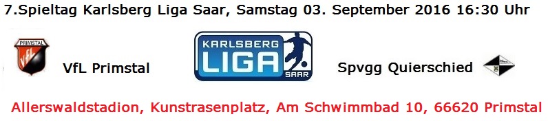 VfL Primstal: Der VfL Primstal steht mit seiner 1. Mannschaft auf dem 5. Platz der Karlsberg Liga. In den ersten 5 Spielen wurden 10 Punkte (3 Siege, 1 Remis, 1 Niederlage) eingefahren, einmal war man spielfrei. Dabei hat die Mannschaft aus dem größten Ortsteil von Nonnweiler ein Torverhältnis von 9:5 vorzuweisen. Zuhause wurde vom VfL noch kein eigenes Tor erzielt. Außerdem auch noch kein Sieg. Die beiden Heimspiele endeten gegen den VFB Dillingen (Eröffnungsspiel Karlsberg Liga) 0:3 und gegen den TuS Herrensohr 0:0. Erfolgreichster Torschütze des VfL ist derzeit Lukas Biehl mit 4 Toren. Trainiert wird der letztjährige Tabellendritte von Andreas Caryot, der seit 2015 im Amt ist. Er war davor viele Jahre in Thalexweiler tätig. Der VfL Primstal hat in den letzten Jahren eine tolle Entwicklung genommen und ist mittlerweile eine feste Größe in Saarlands höchster Liga. Mit dem Allerswaldstadion am Schwimmbad verfügt der Verein über eine schmucke Sportstätte mit einem modernen Kunstrasenplatz, in der neben der Erstgarnitur auch die 2. Mannschaft nach der letztjährigen Meisterschaft jetzt in der Verbandsliga Nord-Ost antritt. Auch in der Jugendarbeit ist der VfL engagiert, so spielen die kleinen Jugendteams eigenständig, ab den höheren Altersklassen ist der Club Mitglied in der JFG Schaumberg-Prims.