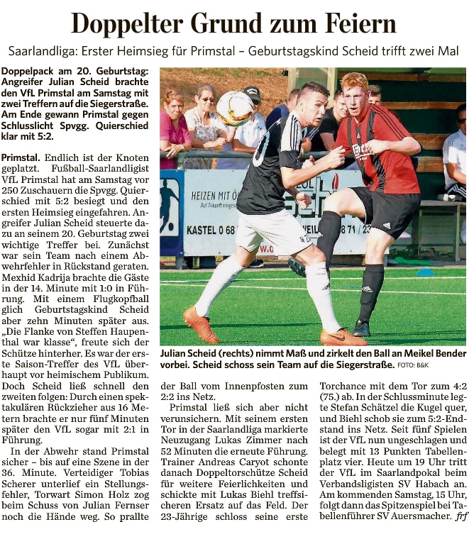 7.Spieltag Karlsberg Liga Sa. 03.09.16 16:30 Uhr VfL Primstal – Spvgg Quierschied 5:2 (2:2)