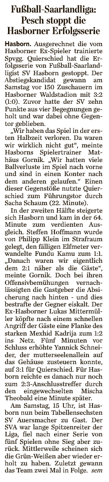 - Hinspiel Karlsberg Liga: Hasborn – Quierschied. Endstand 2:3.