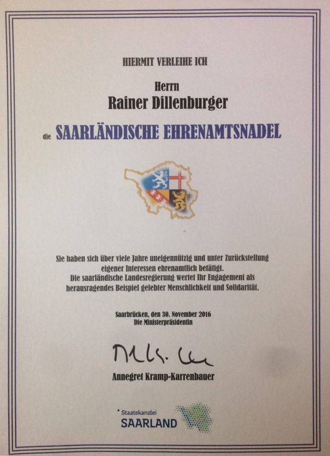 Wenn es einer verdient hat, dann unser „Opa“! Reinhold „Opa“ Dillenburgerist seit fast drei Jahrzehnten die gute Seele bei der Spvgg. Quierschied. Ende November wurde ihm in Quierschied von Ministerpräsidentin Annegret Kramp-Karrenbauer und Bürgermeister Lutz Maurer die saarländische Ehrenamtsnadel verliehen. Wir sagen: Herzlichen Glückwunsch, Opa! Und vielen Dank für deinen unermüdlichen ehrenamtlichen Einsatz für unseren Verein!