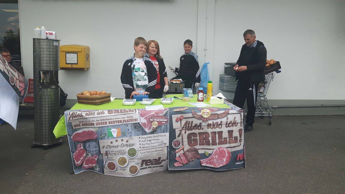 Am vergangenen Samstag war die E-Jugend nicht nur auf dem Feld im Einsatz. Vor dem Real-Markt in Dudweiler durften die Spielerinnen und Spieler ihre Mannschaftskasse aufbessern und Rostwürste an die Kunden des Einkaufszentrums verkaufen. Ein besonderer Dank geht an die Organisatorin Jenny Ihl. Ein ganz herzliches Dankeschön geht auch an Lena de Mario, die uns zusammen mit Jenny bis zur letzten Minute unterstützt hat – sogar beim Reinigen der Sachen. 😘😀 Im Namen der E-Jugend sagen die Trainer Mario und Hissen: „Vielen Dank!“