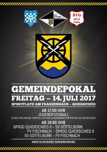 Am Freitag den 14. Juli findet auf unserem Sportplatz am Franzenhaus in Quierschied der diesjährige Gemeindepokal statt. Teilnehmen werden die drei Mannschaften FV Fischbach, SV Göttelborn sowie unsere Bezirksligamannschaft der Spvgg Quierschied. Die Spiele beginnen ab 18 Uhr. Zudem gibt es ab 17 Uhr Jugendfußball aus der Gemeinde und die Vorstellung der Jugendmannschaften der JSG Quierschied. Wir hoffen auf viele Zuschauer aus der Gemeinde, für Speis und Trank ist bestens gesorgt.