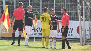 Die Führung lag für unsere Mannschaft in der Luft, dennoch hatte man vor dem Pausenpfiff großes Glück. Denn nach einem Schuss aus der zweiten Reihe klärte Dominik Engel im letzten Moment auf der Linie. Mit dem 0:0 ging es in einer intensiv geführten Partie vor 400 Zuschauern im Ellenfeld in die Halbzeitpause. Trainer Bauer musste wechseln, der gelb-rot gefährdete Weber wurde durch Reichrath ersetzt. Unsere Mannschaft fand nicht so dynamisch wie zu Beginn des Spiels zurück in die Begegnung. Neunkirchen kam so, ohne großartige Mühe zum 1:0. Nach einer Vorlage von der rechten Seite kam Ruschmann am langen Pfosten angerauscht und verwandelte zur Führung. Zwei Minuten nach dem Tor für Neunkirchen hatte Mittermüller nach Vorlage von Nickels sofort den Ausgleich auf dem Fuß. Alleine vor dem Tor landete seine Direktabnahme über dem Kasten von Persch. Neunkirchen machte es besser. In der 56. Minute verwandelte Kamil Czeremurzynski einen Eckball per Kopf zum 2:0.