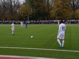 Lukas Mittermüller und Dominik Engel bei einem ruhenden Ball. Im Hintergrund ist die tolle Kulisse beim Derby zu sehen.