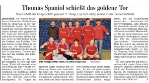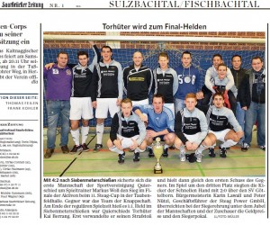 In der Endrunde der Nicht Aktiven standen die Knappschaft, die Hasborn Allstars, das Dudobad Dudweiler sowie der Judoclub Quierschied. Im ersten Halbfinale kam es zum Duell der Knappschaft gegen den Judoclub. Diese Partie endete 4:1 für die Knappen. Auch das zweite Halbfinale wurde deutlich. Die Hasborn Allstars setzten sich gegen das Dudboad mit 4:0 durch. Den 3. Platz erreichte die Mannschaft aus Dudweiler mit einem 3:1 Erfolg gegen den Judoclub. Im Finale wurde es dann noch einmal richtig spannend. Die Knappen lieferterten sich mit den Hasborn Allstars einen offenen Schlagabtausch. Thomas Spaniol entschied die Partie mit seinem Tor zum 1:0. Quasi mit dem Schlusssignal hatten die Allstars den Ausgleich auf dem Fuß, doch der Schuss der einzigen Frau in diesem Endspiel strich knapp am Kasten von Thomas Seitner vorbei.