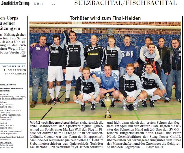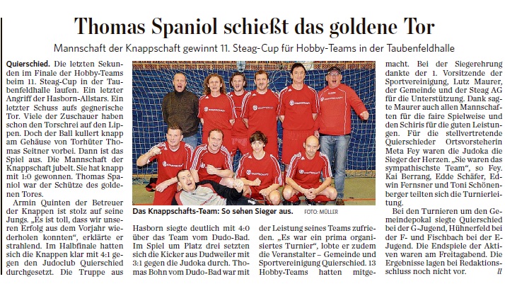 „Wir sind sowohl mit dem Ergebnis, als auch mit dem Ablauf des diesjährigen STEAG-Cups sehr zufrieden“, sagte Vorstandsvorsitzender Lutz Maurer Anfang Januar zu dem traditionellen Turnier der Spvgg. und der Gemeinde Quierschied, das „zwischen den Tagen“ in der Taubenfeldhalle ausgetragen wurde. „Mitglieder aller Sparten haben als Helfer zum großen Erfolg des Turniers beigetragen. Sportlich war es ein faires und spannendes Turnier mit 28 Mannschaften. Wir freuen uns schon auf den 12. Steag Cup Ende 2012“, ergänzte Maurer