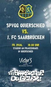 Am Freitagabend ist der 1. FC Saarbrücken wieder zu seinem ersten Vorbereitungsspiel im Sommer bei unserer Sportvereinigung Quierschied zu Gast. Die Elf von Trainer Dirk Lottner trifft im traditionellen Testspiel auf unsere 1. Mannschaft. Anstoß wird um 18:00 Uhr auf unserem Rasenplatz sein. Die Kassen und Verkaufsbuden öffnen ab 16:30 Uhr. Der Eintritt kostet wie in den letzten Jahren 5 Euro für Erwachsene und 3 Euro für Jugendliche (ab 16) und Versehrte. Wie in den Jahren zuvor rechnet unsere Sportvereinigung mit bis zu 1000 Zuschauern.