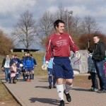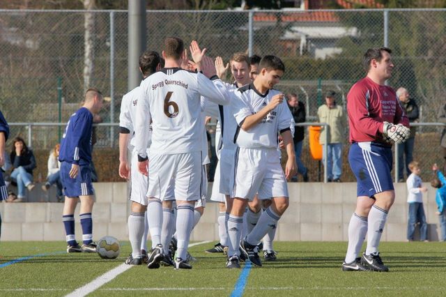 Quierschied hatte das Spiel von Beginn an im Griff, kam jedoch gegen die sehr tief stehende und defensiv agierende DJK zunächst nicht gefährlich vor deren Tor. Nach 6 Minuten gab es dann bereits die erste Schrecksekunde für die Gastgeber, als Angreifer Sascha Hauch im einem Laufduell mit Christian Schwartz umknickte und anschließend ausgewechselt werden musste. Von dieser Stelle wünschen wir dem Spieler gute Besserung! Im Laufe der ersten Häfte wurde die Spvgg. etwas zu statisch nach Vorne, es fehlte die Bewegung im Spiel um das Bollwerk der Heimelf von Trainer Jürgen Bolz zu knacken. Mit einer guten Konterchance wäre die DJK sogar fast in Führung gegangen: Stürmer Kevin Kiehn lief alleine auf Quierschieds Torwart Kai Berrang zu, schoss den Ball jedoch am Tor vorbei. Danach gab es auch auf der Gegenseite gute Möglichkeiten, doch bis zur 38. Spielminute hielt Keeper Kai Steinhauser seinen Kasten sauber. Dann gab es für Quierschied einen Freistoß aus aussichtsreicher Position. Oliver Wirth hämmerte den Ball an die Latte, der anschließende Abpraller landete bei Torjäger Andreas Breier. Breier überlupfte Steinhauser und traf zum 1:0 für Quierschied. Mit diesem Spielstand ging es in die Halbzeitpause. Eine knappe Führung für den Tabellenführer, der sich gegen tapfer kämpfende Gastgeber bis dato nicht einfach tat. In der Pause wechselte sich Spielertrainer Markus Woll für Oliver Wirth selbst ein. Die erste Szene der zweiten Hälfte gehörte der DJK. Nach einem Pass in die Spitze tauchte Marco Müller vor dem Kasten der Spvgg. auf und vollstreckte überraschend zum 1:1-Ausgleich. Dieser Treffer schien notwendig, um die Spvgg. aufzuwecken und zu noch mehr Engagement aufzufordern. Vor allem Markus Woll sorgte anschließend für mehr Schwung und Kreativität im Spiel nach vorne. Auch eine weitere Umstellung machte sich bezahlt. Dominik Schaum agierte jetzt auf der rechten Verteidiger-Position, sodass über die linke anfällige Seite der Heimelf noch mehr Gefahr ausgehen sollte. Schaum sorgte mit einer mustergültigen Flanke für eine wunderbare Vorlage an seinen Mannschaftskameraden Andreas Breier. Der setzte sich im Luftkampf robust gegen zwei Gegenspieler durch und köpfte den Ball unhaltbar zum 2:1 ins lange Eck. Quierschied suchte nun die Entscheidung und fand diese vermeintlich durch Markus Wolls 3:1 nach 62. Minuten. Anstatt das Spiel endgültig zu Gunsten der Gäste zu entscheiden schoss Woll einen an Breier verursachten Foulelfmeter über das Tor. Hendrik Grätz war dafür wenig später zur Stelle und traf nach einem Traumpass von Dennis Dillenburger mit einem strammen Schuss ins Eck für das 4:1. Die Moral der DJK Rastpfuhl war dadurch noch immer nicht gebrochen und so konnte die Bolz-Elf nach einer Standardsituation per Kopf durch Felix Akef auf 4:2 verkürzen. Der eingewechselte Sven Schirra setzte eine Viertelstunde vor dem Ende seinen Mitspieler Manuel Allard in Szene, der mit dem letzten Treffer im Spiel den Endstand zum 5:2 herstellte.