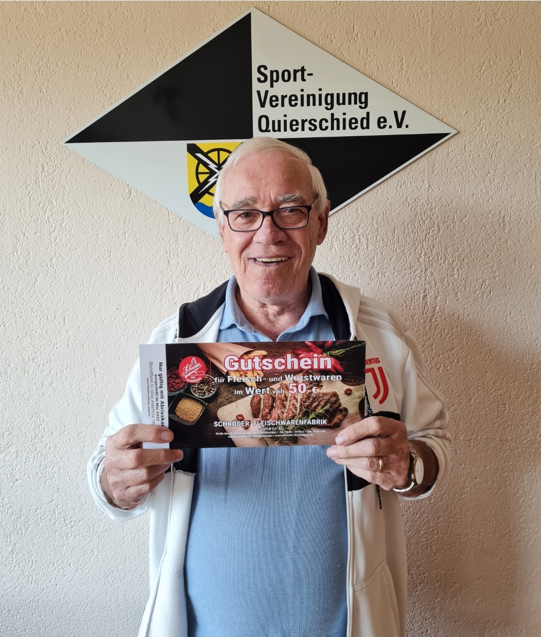 Am Samstag, den 14. Mai, war unser Spieler Mirco Zavaglia zu Gast im Aktuellen Sportstudio des ZDF. Dabei durfte er auf die legendäre Torwand schießen. Gegner war der Sportdirektor des FC Schalke 04, Rouven Schröder. Via Facebook haben wir zu einem Tippspiel aufgerufen, wie viele Treffer von Mirco denn fallen werden. Dabei konnte man beim Tippspiel einen 50€ Gutschein unseres Partners Schröder Fleischwaren gewinnen. Die Firma Schröder, Namensgeber der Spielklasse unserer 1. Mannschaft (Schröder Liga Saar), ist seit Sommer 2021 Partner unserer Spvgg und sorgt für die leckeren Grillspezialitäten bei Heimspielen und Events unseres Vereins. Herr Giancarlo Pilla aus Bildstock gab den richtigen Tipp ab (leider fielen keine Treffer, also 0) und wurde als Sieger des Gutscheins ausgelost. Wir sagen herzlichen Glückwunsch, der Gutschein wurde am Dienstag in unserem Clubheim übergeben. Gleichzeitig auch Danke an Schröder Fleischwaren für die Unterstützung dieser Aktion.