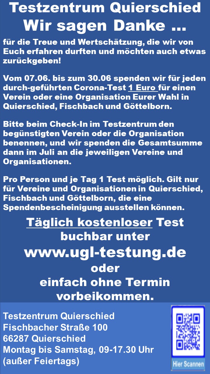 Das UGL Testzentrum in Quierschied unterstützt mit einer schönen Aktion die Vereine in der Gemeinde. Mit jedem durchgeführten Corona-Test könnt Ihr für unsere Spvgg Spenden einsammeln. Gibt dabei beim Check-In unsere Spvgg als Verein an! Die Aktion läuft bis zum 30.06.