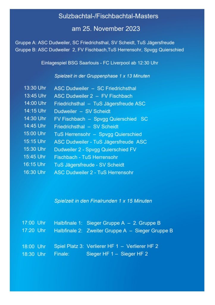 Am Samstag den 25.11.23 ist unsere AH-32 in der Halle am Ball. Dann steigt im Sportzentrum Dudweiler das Sulzbachtal/Fischbachtal-Masters vom ASC Dudweiler. Ein traditionsreiches Turnier, bei dem man sicherlich wieder zahlreiche Fußballfreunde treffen wird. Unsere AH spielt ab 14:30 Uhr und würde sich über Unterstützung freuen.