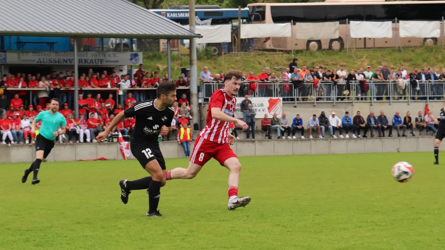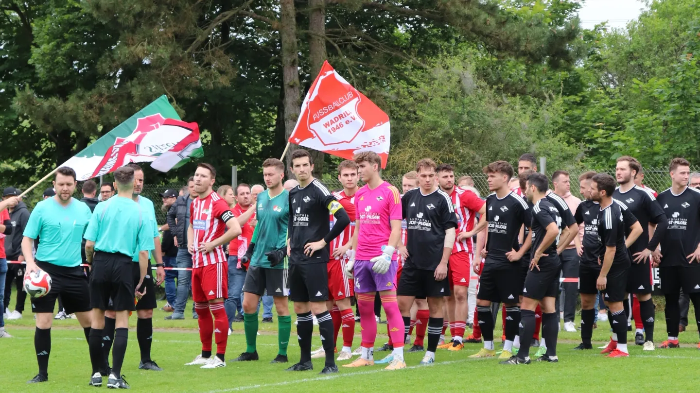Vor fast 1000 Zuschauern startete dann die Partie auf dem Rasenplatz in Düren. Unsere Fans sorgten für gute Stimmung, genau so muss man dem Gegner aus Wadrill-Sitzerath ein großes Lob für ihre zahlreiche und laute Unterstützung aussprechen. In der ersten Viertelstunde war die SG Wadrill-Sitzerath die deutlich überlegenere Mannschaft. Unsere Jungs kamen kaum ins Spiel und wurden von den Gegnern überrollt. Nach und nach kam unsere Mannschaft besser ins Spiel. Nach 1,2 guten Chancen von Wadrill-Sitzerath hatte Dominik Engel unsere erste Großchance. Nach einem starken Ballgewinn im Mittelfeld lief Engel alleine aufs Tor. Am Ende scheiterte er am Schlussmann Melvin Semark, welcher den Ball stark parieren konnte. Nur eine Minute später kam die „SG Wa-Si“ über die linke Seite. Der Ball wurde dann in den Rückraum gelegt, in dem Julian Flesch völlig alleinstand und aus 11 Metern zum 1:0 oben rechts in das Eck verwandelte. Daraufhin hatte unsere Gegner erneut einige Chancen, aber auch unsere Mannschaft hatte vereinzelte Möglichkeiten. Ein Spiel, in dem es nach einer Halbzeit auch 3:2 oder 4:3 hätte stehen können.
