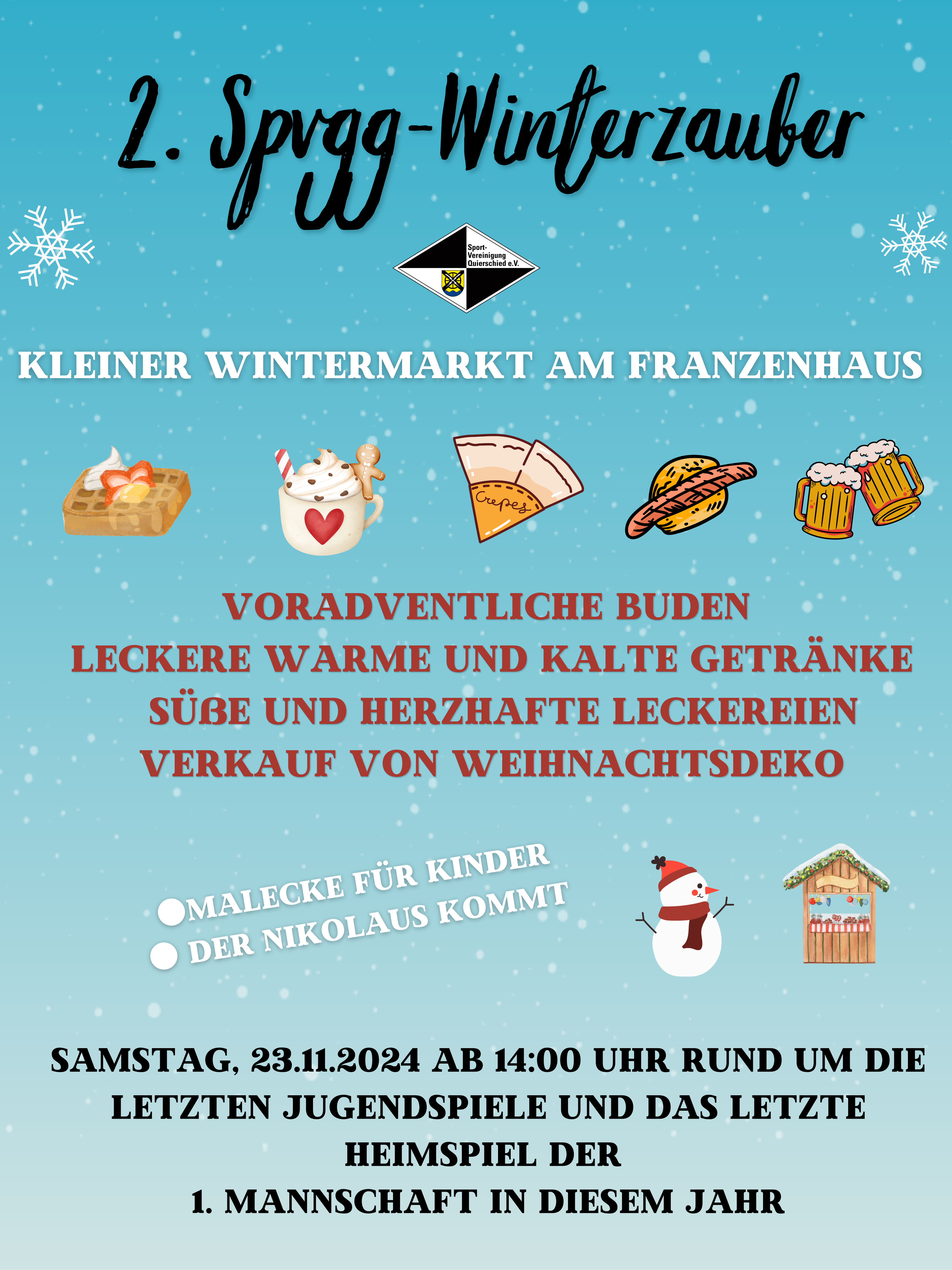Am Samstag, den 23. November veranstalten wir ab 14 Uhr auf dem Sportplatz wieder unseren 2. Spvgg-Winterzauber. Rund um die letzten Jugendspiele und das letzte Erstmannschaftsspiel 2024.