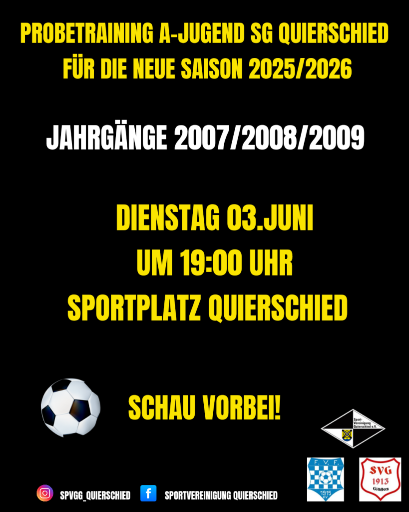 Auch unsere A-Jugend der SG Quierschied lädt alle interessierten Kicker zu einem Probe- bzw. Sichtungstraining ein. Ansprechen möchten wir hiermit die Jahrgänge 2007/2008 oder gerne auch 2009. Die Einheit findet am Dienstag, den 03.06. um 19:00 Uhr auf unserem Sportplatz in Quierschied, Holzer Straße statt. Gerne könnt ihr spontan vorbei schauen oder euch vorher kurz anmelden bei Trainer Markus Ackermann 0176 83019479. Wir freuen uns auf euch!