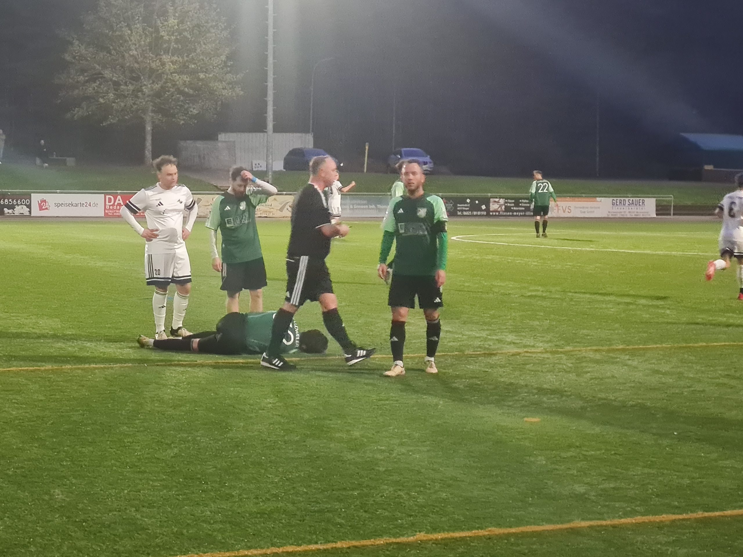 Nach circa 25 Minuten fiel dann das vermeintlich erste Tor. Nach einem langen Ball lief der Torhüter der Gäste aus seinem Tor. Sascha Schaum probierte den Ball zu erlaufen, allerdings war der Keeper zuerst am Ball und lief dann in unseren Stürmer hinein. Der geklärte Ball landete auf dem Fuß von Ben Büch. Dieser schoss den Ball aus circa 30 Metern in das leere Tor, der Schiedsrichter entschied aber auf Foul von Sascha Schaum. Gegen Ende des ersten Durchgangs vergab unsere Zwädd dann noch zwei gute Chancen. So ging es mit einem 0:0 in die Halbzeitpause.