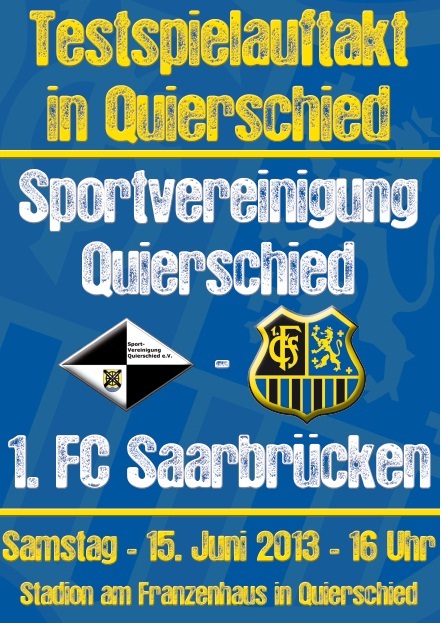 Dass das erste Vorbereitungsspiel des besten saarländischen Fußballvereins – des Drittligisten 1. FC Saarbrücken – wieder in Quierschied stattfindet, wissen mittlerweile alle FCS-Fans. Dass der Gegner wieder die 1. Mannschaft der Spvgg. Quierschied sein wird, freut unsere Anhänger und natürlich unsere Spieler, die sich gerne mit den Profis messen. Das Duell Drittligist gegen Achtligist findet am 15. Juni auf dem Sportplatz am Franzenhaus statt. Anstoß ist um 16 Uhr. Direkt im Anschluss an das Testspiel (ca. 18 Uhr) werden wir neben dem Sportplatz die Auslosung der ersten Runde des DFB-Pokals LIVE übertragen. Zum „Public Viewing“ mit der Mannschaft des FCS, die sich selbst im Lostopf befindet, landen wir recht herzlich ein!