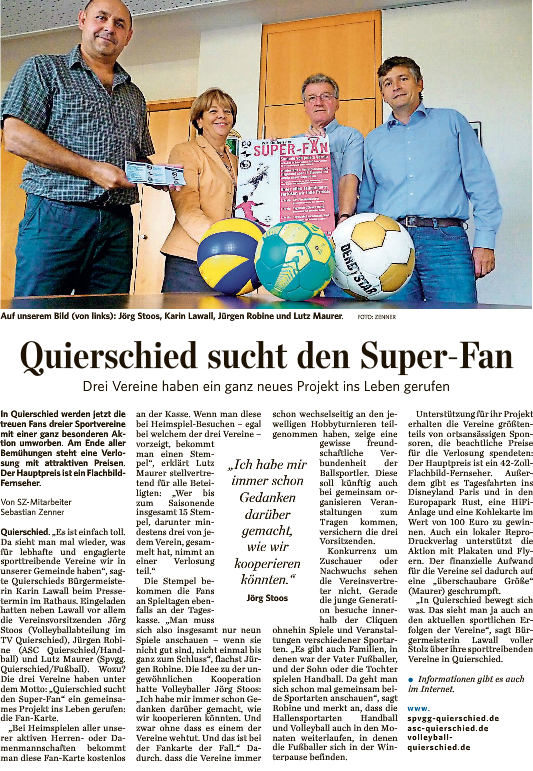 Wenn Vereine aus einem Ort zusammenarbeiten, ist das immer eine gute Sache. Mit der „Fankarte“ haben sich die Vorsitzenden der Quierschieder Volleyball-, Handball- und Fußballvereine ein Projekt ausgedacht, bei dem jeder nur profitieren kann. Die Vereine können sich über neue Zuschauer aus anderen Sportarten freuen, die Zuschauer haben die Möglichkeit, tolle Preise zu gewinnen. Was sie dafür tun müssen? Einfach Fankarte besorgen, 15 Spiele (mindestens drei jeder Sportart) von aktiven Mannschaften der drei genannten Vereine anschauen, Stempel sammeln und an der Verlosung teilnehmen!