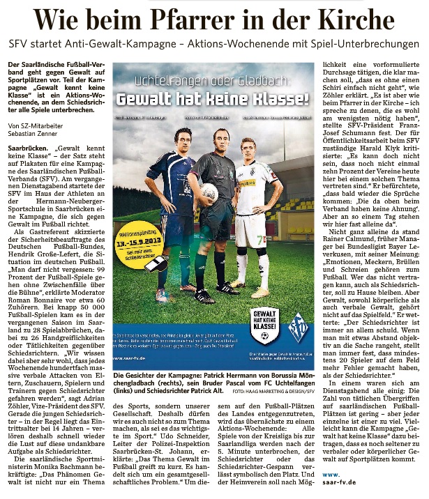 Gewalt in Stadien bzw. auf Sportplätzen ist schon lange kein Tabuthema mehr und auch in der Medienberichterstattung präsent.Die Zahl der gemeldeten Spielabbrüche bzw. Ausschreitungen auf saarländischen Fußballplätzen ist erfreulich gering. Dennoch schaden jede einzelne Ausschreitung, jede Tätlichkeit gegenüber Spielern, Zuschauern oder Schiedsrichtern und jeder Spielabbruch dem Ansehen des Fußballs. Der SFV stellt sich seiner Verantwortung, den Spielbetrieb zu ermöglichen und gleichzeitig den Schutz für alle Beteiligten sicherzustellen. Am 03.09.2013 fand hierzu ein Dialog mit allen Vereinen an der Hermann-Neuberger-Sportschule statt. Für den Fußballverband war diese Veranstaltung der Auftakt zu einer Anti-Gewalt-Kampagne saarlandweit. (Quelle: www.saar-fv.de)