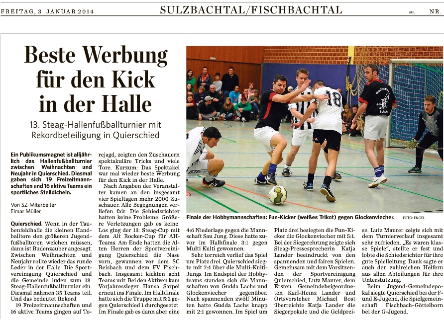 Der 13. Steag Cup 2013 war wieder ein Erfolg auf ganzer Linie. Am Samstagmorgen ging es mit den Nicht-Aktiven los. Dabei kämpften 18 Mannschaften in den Vorrundengruppen um den Einzug in die Zwischenrunde, die noch am Samstagabend ausgespielt wurde. Leider erschien eine Mannschaft nicht, sodass ausgerechnet in der einzigen Vierergruppe – neben drei Fünfergruppen eine Mannschaft wegfiel. In der Zwischenrunde konnten sich am Samstagabend die Mannschaften von FC Uralt, SG Gudda Lachs, den Funkickers und Die Glockenviecher für die Enderunde am Montag qualifizieren. Die Halle war über den gesamten Tag sehr gut besucht, die Zuschauer sahen viele faire und spannende Spiele. Am Sonntagmorgen ging es mit den Aktiven weiter. 16 Teams waren in diesem jahr mit dabei. Dabei stand in der ersten Vorrundengruppe auch die Mannschaft der Spvgg Quierschied II. Die Truppe von Coach Hans Eiler konnte sich als Zweiter für die Zwischenrunde qualifizieren. Am Nachmittag stieg auch die 1. Mannschaft der Spvgg in das Geschehen ein, sie erzielte drei Siege in der Vorrunde und kam somit auch in die Zwischenrunde. Diese fand in der erneut gut besuchten Taubenfeldhalle am Sonntagabend statt. Mit der Spvgg Quierschied I, Mutli-Kulti, Hansa Sarpai sowie Sau Jung standen die vier Teams für die Endrunde einen Tag später fest. Nachdem am Montagnachmittag die Jugendteams aus Göttelborn, Fischbach und Quierschied den Gemeindepokal ausspielten, stand ab 18 Uhr die Endrunde des Steag Cup an. Dabei spielten die Nicht-Aktiven und Aktiven überkreuz ihre Halbfinalspiele aus. Die Taubenfeldhalle war proppenvoll. Wie an den Tagen zuvor gab es viele spannende Partien zu sehen, erfreulicherweise gab es nur ganz wenige Verletzungen. Am Ende gab es folgende Endplatzierungen:
