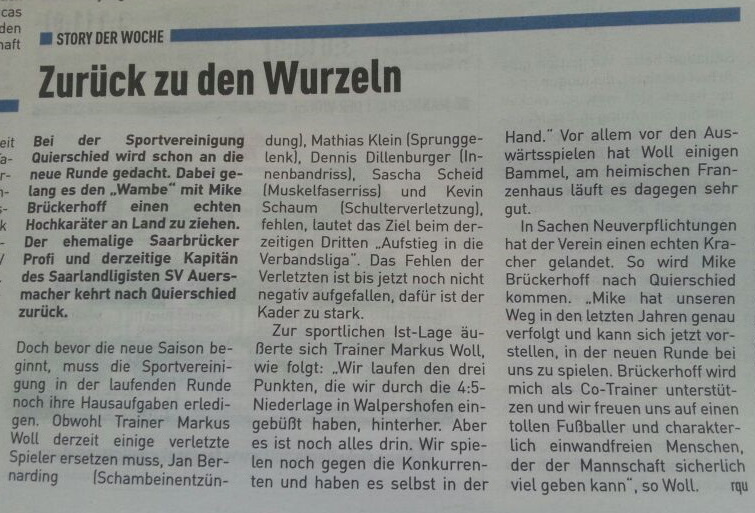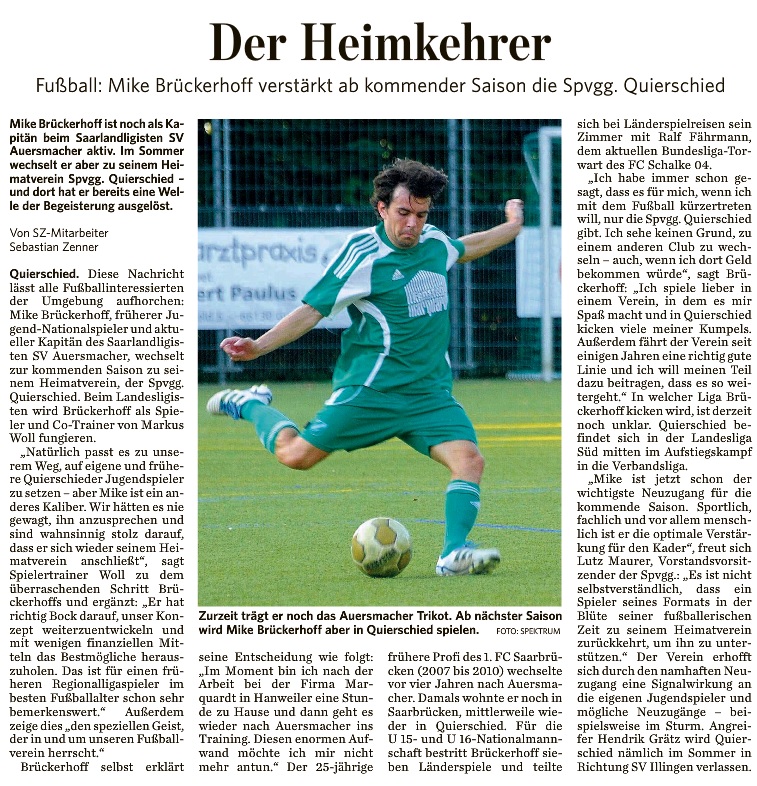 Diese Nachricht schlägt in Quierschied ein wie eine Bombe. Mit dem früheren Jugend-Nationalspieler Mike Brückerhoff kommt der in der Jugend der Spvgg. Quierschied ausgebildete aktuelle Kapitän des Saarlandligisten SV Auersmacher im Sommer zurück zu seiner alten Wirkungsstätte. In seinem Heimatverein wird Brückerhoff als Spieler und Co-Trainer von Markus Woll fungieren. Der 25-jährige frühere Profi des 1. FC Saarbrücken (2007 bis 2010) wechselte vor vier Jahren nach Auersmacher. Für die U15- und U16-Nationalmannschaft bestritt Brückerhoff sieben Länderspiele. Mit Ralf Fährmann, dem aktuellen Bundesliga-Torwart des FC Schalke 04, teilte er sich damals bei Länderspielreisen ein Zimmer.
