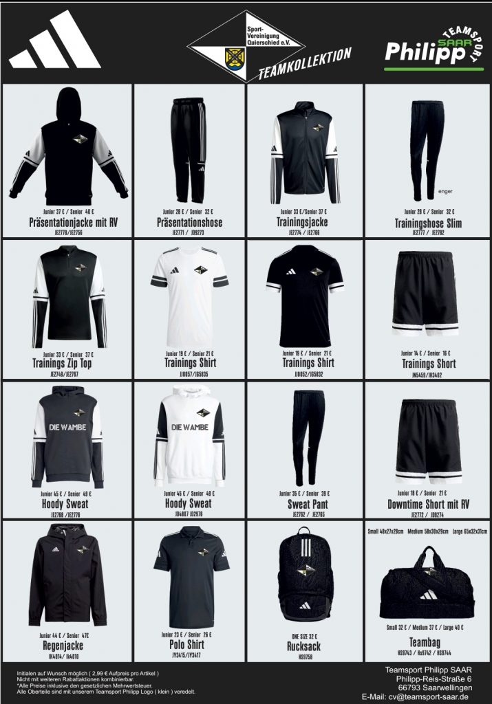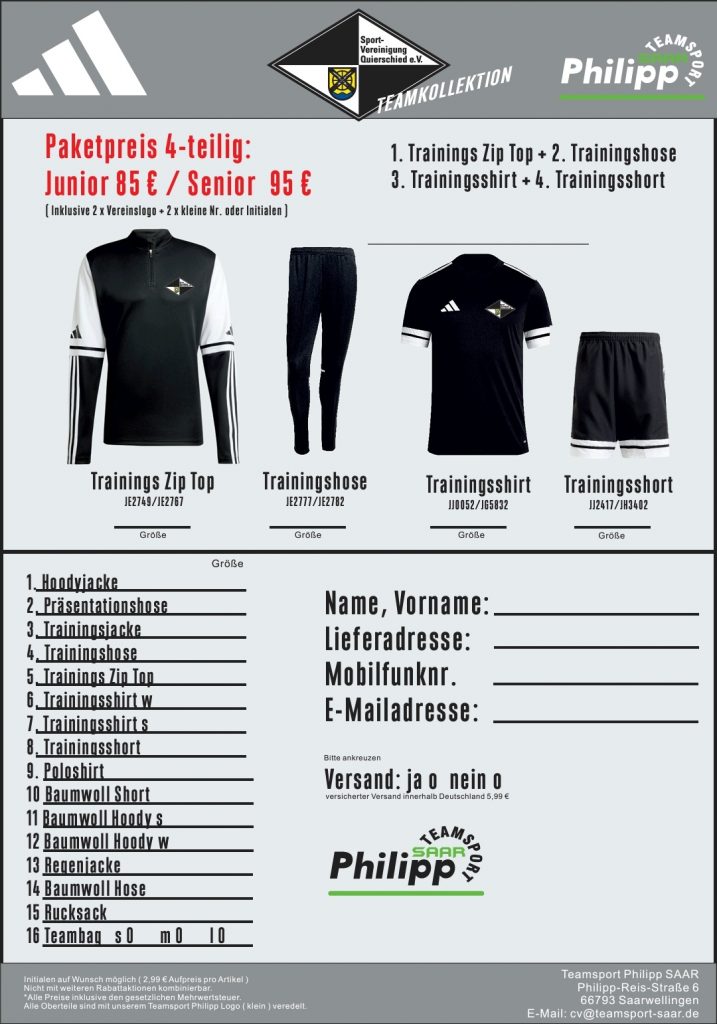 Unsere Sportvereinigung Quierschied präsentiert mit Teamsport Philipp Saar ab Sommer 2025 einen neuen Ausrüster. Die neue Kooperation wurde zunächst für zwei Jahre festgelegt, mit dem gemeinsamen Ziel eine langjährige Partnerschaft daraus entstehen zu lassen. Weiterhin wird unser Verein dabei mit hochwertigen und einheitlichem Teamwear der Marke Adidas ausgestattet.