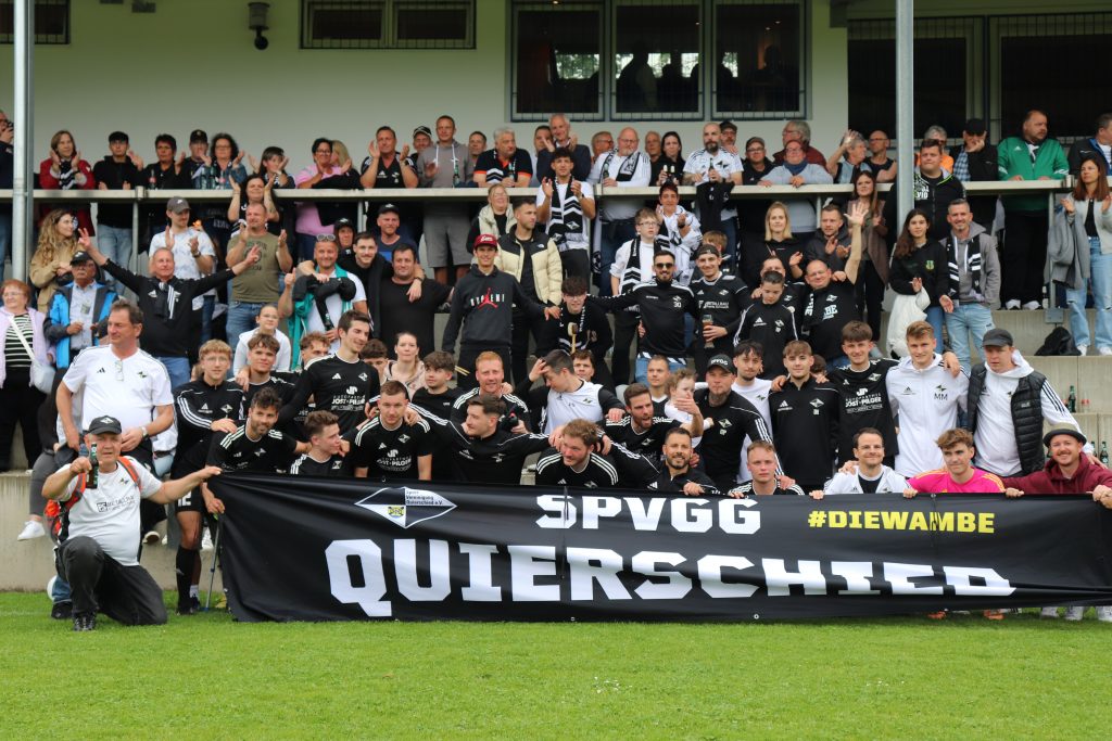 Als einziger verbliebener Konkurrent um den Titel blieb der SV Rot-Weiß Hasborn übrig, der vor der letzten Partie mit 62 Punkten einen weniger als Quierschied hatte. Während Hasborn zuhause den bereits abgestiegenen FV Siersburg als Gegner hatte, welcher letztendlich auch klar mit 8:1 bezwungen wurde, ging es für unsere Mannschaft zum Tabellenfünften SV Bliesmengen-Bolchen, die zuvor sechs Mal am Stück gewinnen konnten. 500 Zuschauer sahen eine nervöse Quierschieder Mannschaft, die aber trotzdem sehr konzentriert spielte. Nach einer torlosen ersten Halbzeit konnte man im zweiten Durchgang durch den Treffern von Mirco Zavaglia (58. Minute) und Lukas Mittermüller (64.) Minute einen 2:0 Vorsprung herstellen. Am Ende wurde es aufgrund des Anschlusstreffers von Bliesmengen-Bolchen noch einmal spannend, aber unsere Jungs brachten die Führung über die Zeit. Und damit war klar: Quierschied wurde zum ersten Mal Meister in der höchsten saarländischen Spielklasse und stieg damit erstmals in der Vereinsgeschichte in die Oberliga Rheinland-Pfalz/Saar auf. Am Ende hatte unsere Mannschaft 66 Punkte bei 83:45 Toren geholt und war das heimstärkste Team der Liga. Eine historische Leistung von Trainer Thomas Bettinger und seiner Truppe.