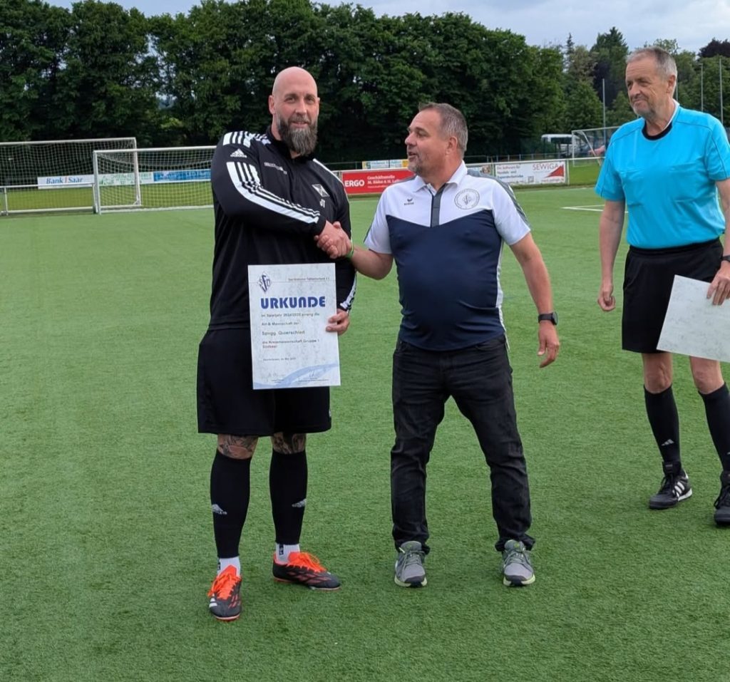 Die Tore in der 70-minütigen Spielzeit schossen Andreas Breier (2) und Markus Woll. Nachdem in der Verlängerung keine Tore fielen, musste im Elfmeterschießen der Sieger ermittelt werden. Und da war unsere Mannschaft dann cooler vom Punkt und entschied das Spiel letztendlich mit 7:5 für sich. Damit wurde unsere Ü-32 nach 2018 erneut Sieger des Saarlandpokals und qualifizierte sich damit für die Südwestdeutsche Meisterschaft im Juli in Edenkoben (Rheinland-Pfalz).