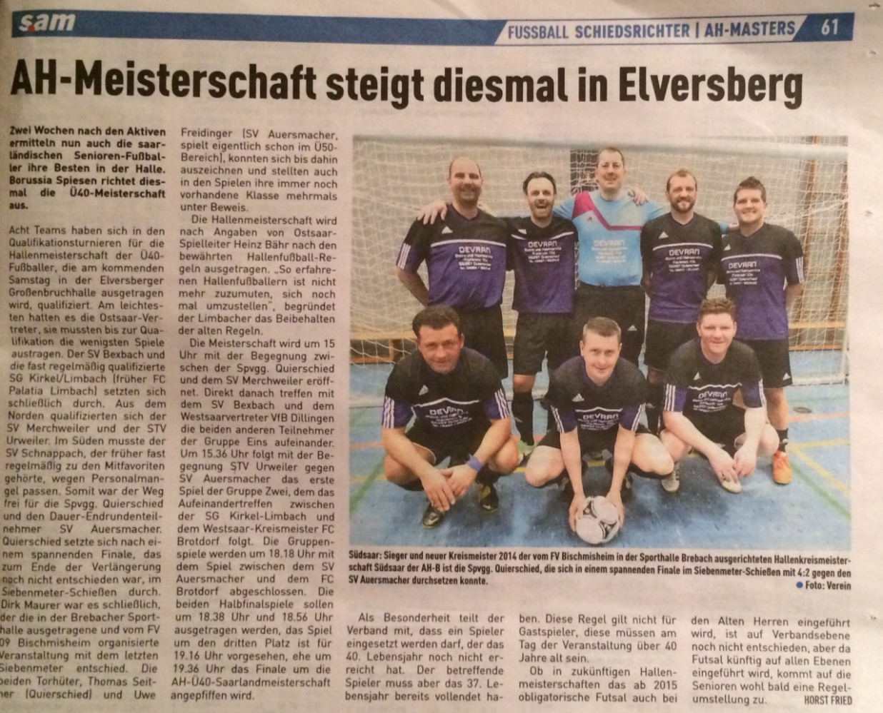 Die besten AH-B-Hallenmannschaften des Saarlandes spielen am kommenden Samstag ab 15:00 Uhr in der Großenbruchhalle in Spiesen-Elversberg ihren Saarlandmeister aus. Als Kreismeister Südsaar sind unsere Altrocker natürlich mit dabei und bestreiten gleich um 15 Uhr das Eröffnungsspiel gegen den SV Merchweiler! Hallen…